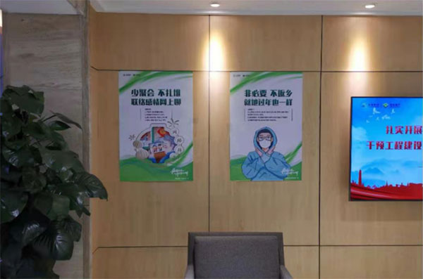 在经发地产办公区,张贴防疫海报,倡导减少出行,原地过年。通过微信群、邮件等发布防疫知识,就大家关心的一些问题给予解答,比如《冷链食品怎么吃更安全》等。