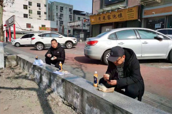 目前,经发地产支援组正深入划分的20个小区落实疫情防控措施。29日中午,经过三个多小时的走访监督,支援组吃完从小超市买来的面包和水,又开始了工作。还有同志表示:为防止中午没时间吃饭,早上吃得饱,可以持续工作。