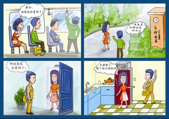 突然听到身后一个伙子的声音“你好”。我回过头去,他说:“请问您是白桦林居的业主吗?我是咱白桦林居物业的”我随即答了声“是”,他紧接着说“不好意思,刚才无意中听到您打电话说家里漏水了,我叫屈晓刚,我刚好没事如果您方便的话,我可以去您家里检查一下”小伙子的态度很热情说话的同时还让我看了一下他的证件。我连忙致谢……到家后,小伙子很熟练的检查,不一会的功夫就修好了,原来是有一处接头当时装修的时候没有装好,所以用了一段时间后就松掉了导致漏水。修好后,我请他在家里玩并拿出水果招待他,他连连摆手说自己还有事情要赶紧回去,叮嘱我一些注意事项给我留下了物业的电话和手机号码就告辞了。后来,我才发现,原来他不但修好了水管就连柜子里的水都清理干净了。